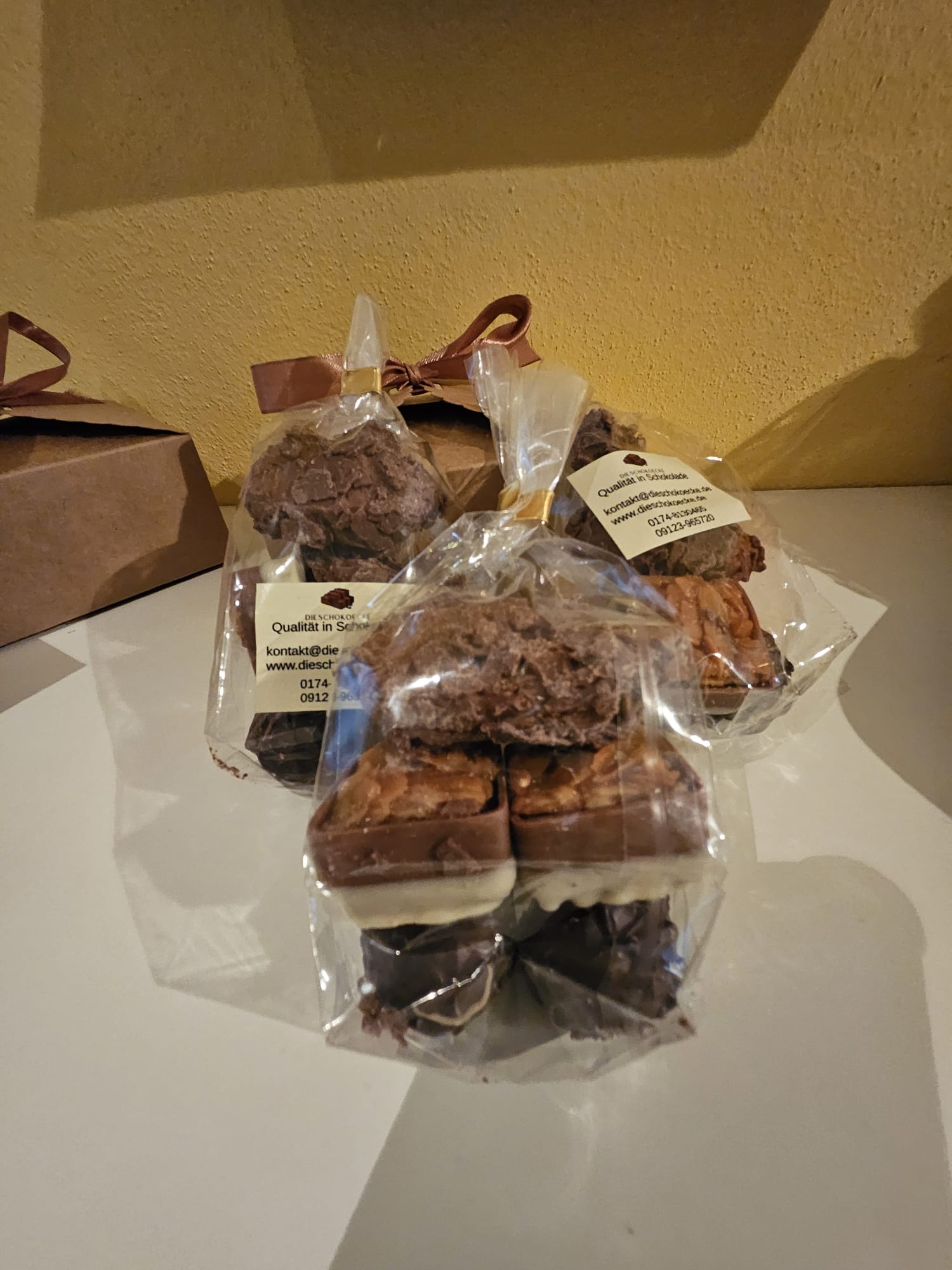 Unsere Trüffel werden in Kraftpapierboxen verpackt. Jede Box wird mit einer Satinschleife verschlossen. Die Farbe der Schleife wechselt je nach Anlass oder Feierlichkeit.